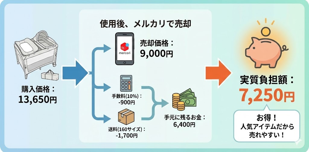 今回はゆりかごタイプを購入し、使用しなくなったタイミングでメルカリで売った場合を計算してみましょう。